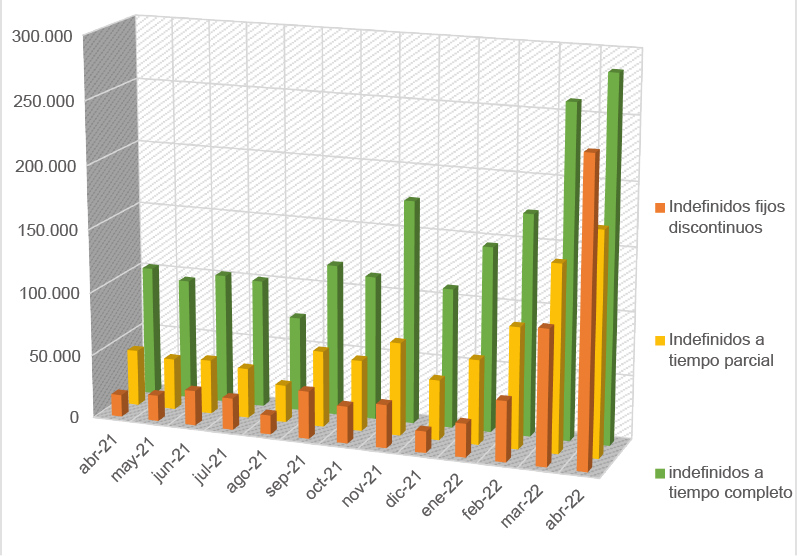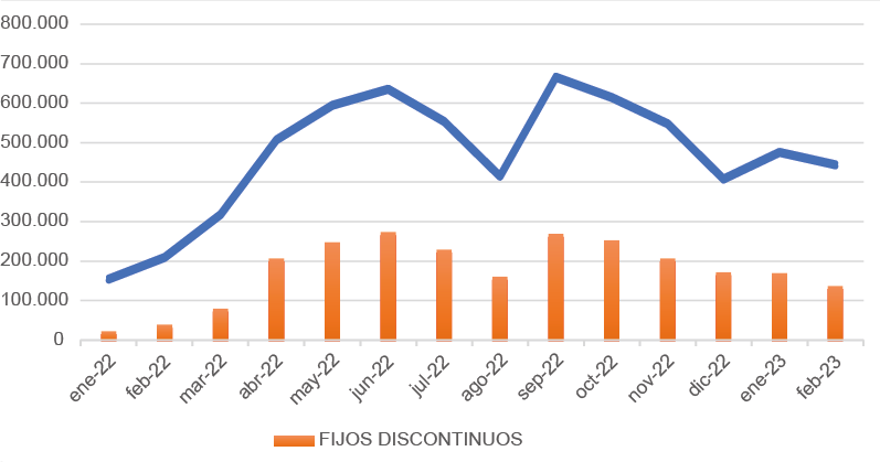 53 Datos ofrecidos por el SEPE: En diciembre de 2021 los contratos fijos discontinuos suponían el 9,6% de los indefinidos, en enero de 2022 el 11,2%, en febrero el 15%, en marzo el 20,6% y en abril el 34,17%. En el periodo de un año han crecido un 1.273%, pasando de los 17.391 contratos mensuales en el mes de abril de 2021 a los 238.760 del mismo mes en 2022. Estos datos contabilizan únicamente los contratos iniciales a trabajadores fijos discontinuos y no los llamamientos posteriores. https://www.sepe.es/HomeSepe/que-es-el-sepe/estadisticas/datos-avance/datos.html. Fecha de consulta:20/02/2023.