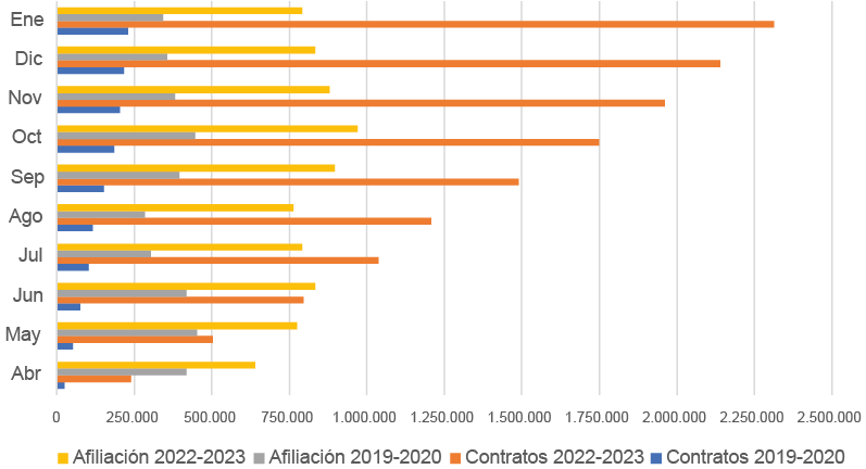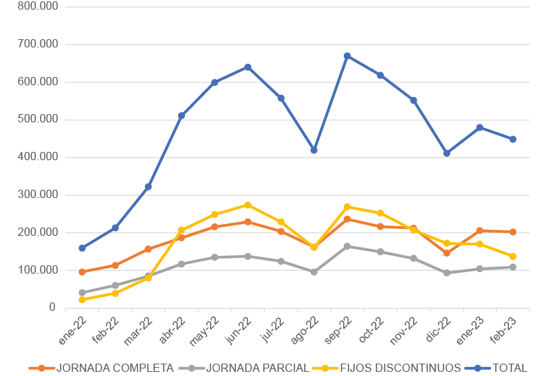 52 Datos ofrecidos por el SEPE. https://www.sepe.es/HomeSepe/que-es-el-sepe/comunicacion-institucional/noticias/detalle-noticia.html?folder=/2023/Febrero/&detail=La-Seguridad-Social-suma-57726-afiliados-en-terminos-desestacionalizados-en-enero. Fecha de consulta: 13/03/2023.
